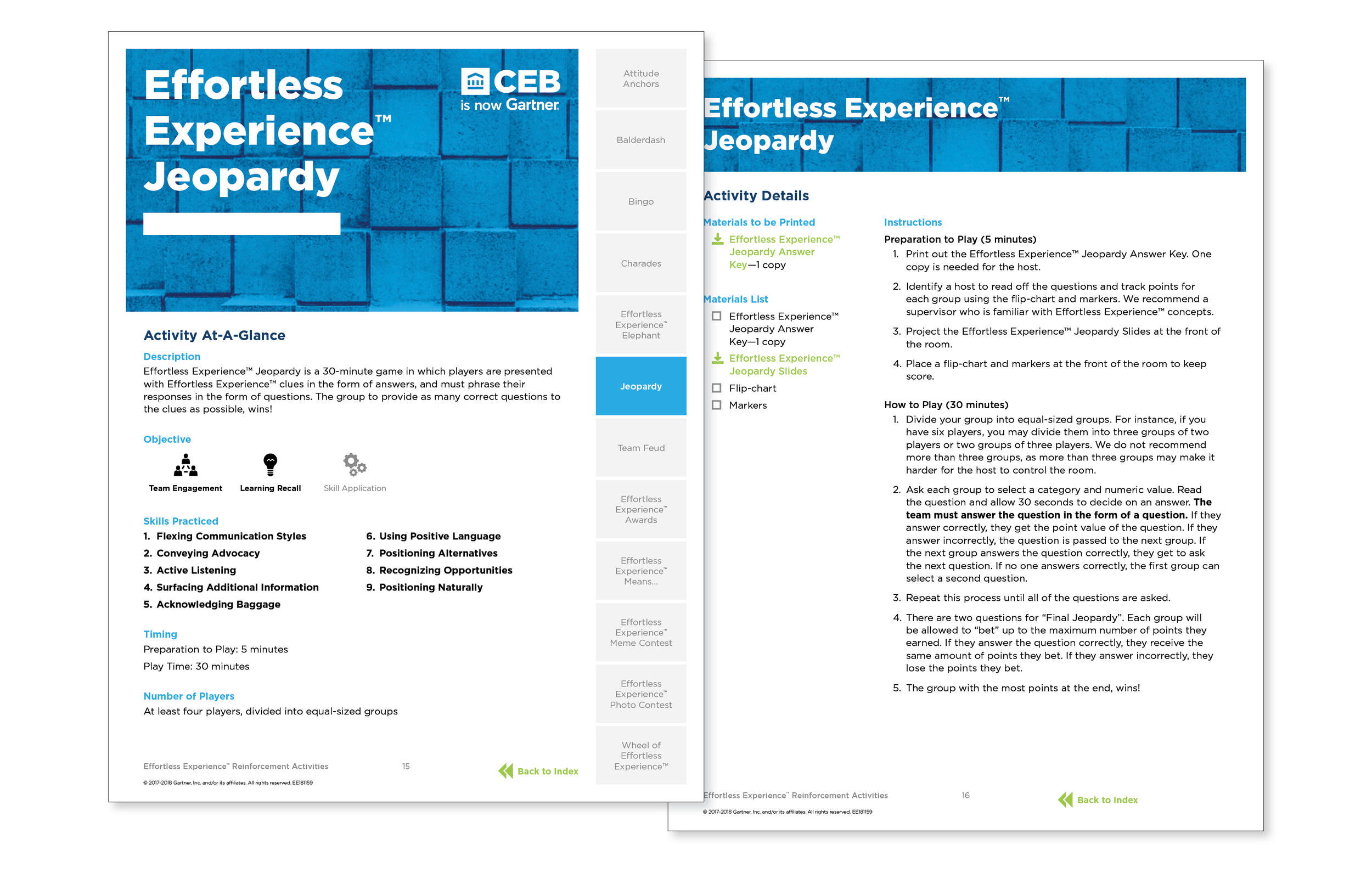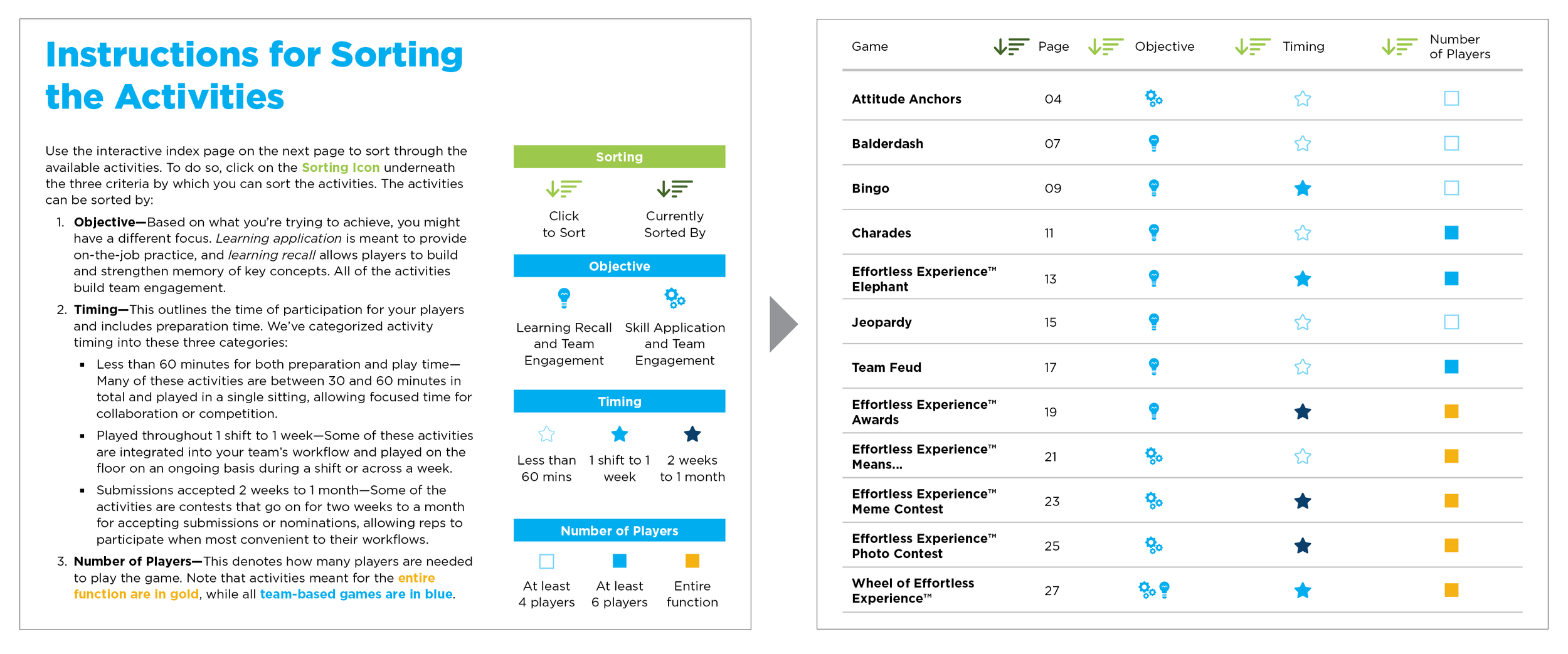 I designed a book of games that managers can use to reinforce key learnings from previous training. The guide includes 12 designed games which a manager can choose from. An interactive table of contents helps filter the game choices by learning objective, timing, or number of players. To keep the design consistent with the playful content, we mimicked a gameboard on the cover. We carried this element through with a roadmap on the interior pages that looked like tiles. Bright colors and photography helped add visual interest.