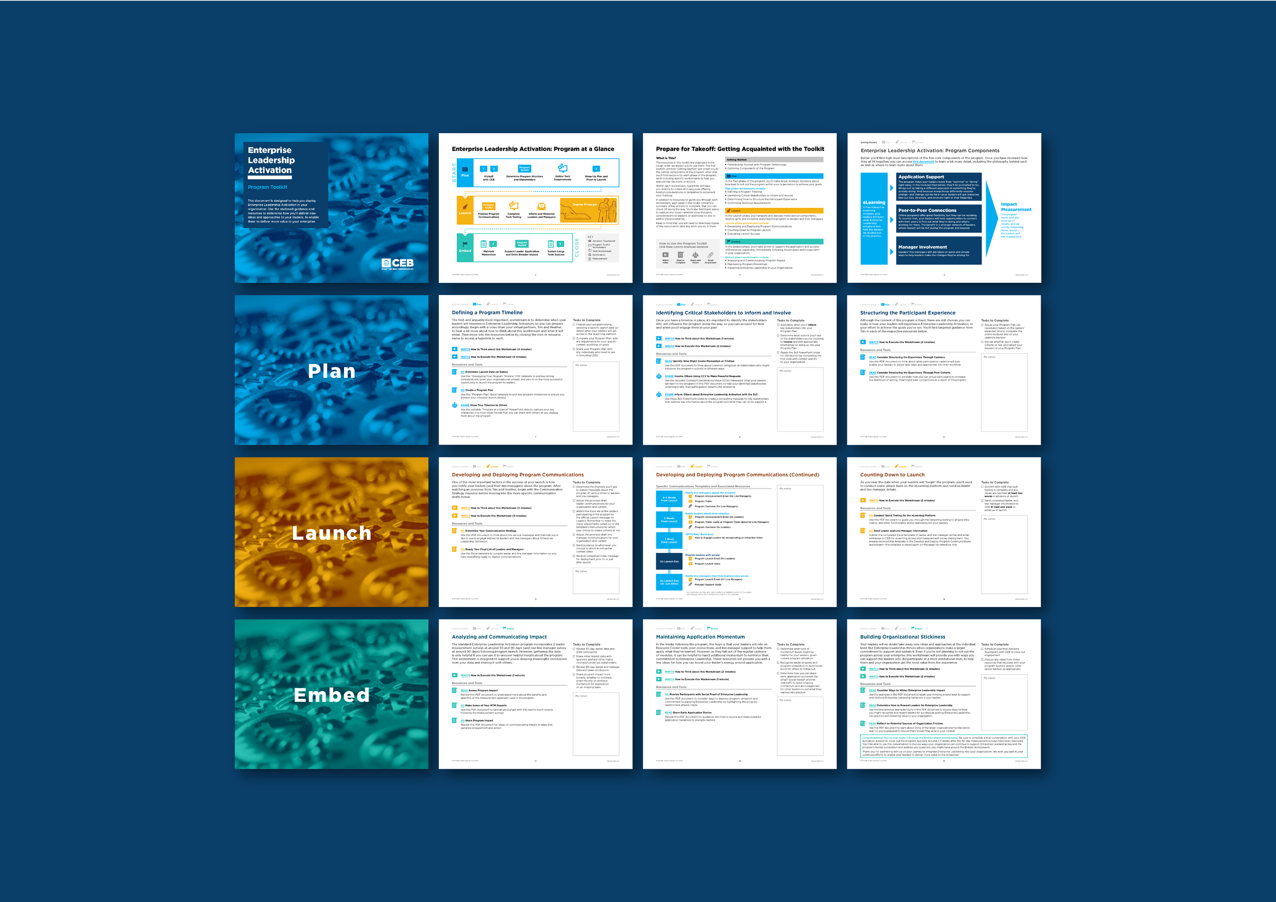 I designed a comprehensive program toolkit to train a sponsor on how to distribute an online program on Enterprise Leadership Activation to multiple participants. Worked closely with learning designers to develop over 40 resources for both the sponsor and participants. The toolkit itself houses all the resources in a master guide that follows chronological order. We intentionally used color and icons to emphasize three phases. There are also areas designed for checking off to-do items and taking notes.